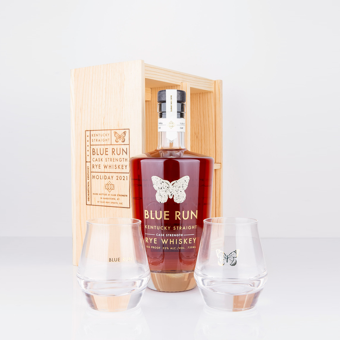 Blue Run Holiday Rye Cask Strength is packaged with two custom Aged and Ore neat glasses in a limited edition collectors box. There are two different designs to choose from, our signature Blue Run insignia or the butterfly crest. Blue Run and Aged and Ore came together out of an appreciation for craftsmanship and thoughtful modern design.